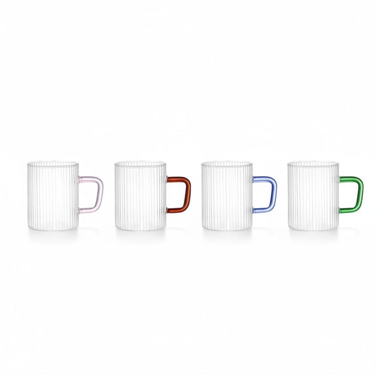 SET OF 4 13.5 OZ BOROSILICATE RIBBED GLASS MUG WITH MULTI-COLORED HANDLE