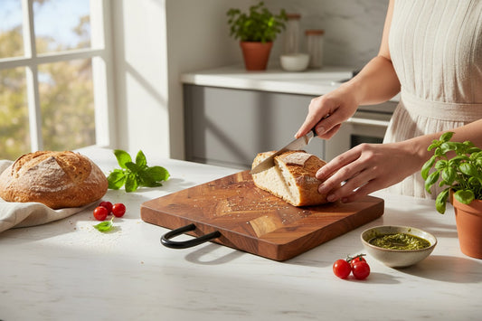 ACACIA WOOD 12" SQUARE CHEVRON BOARD WITH HANDLE